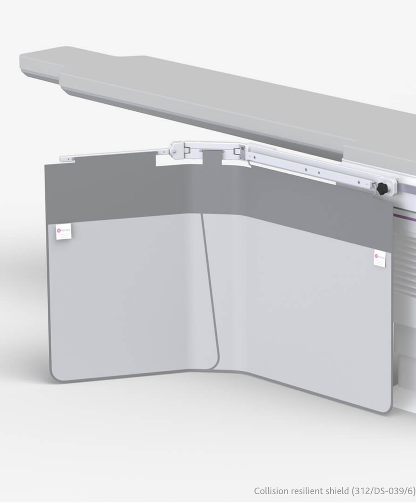 - Fitted with a patented device enabling upward movement of the pivotal arm when in collision with C-arm equipment.